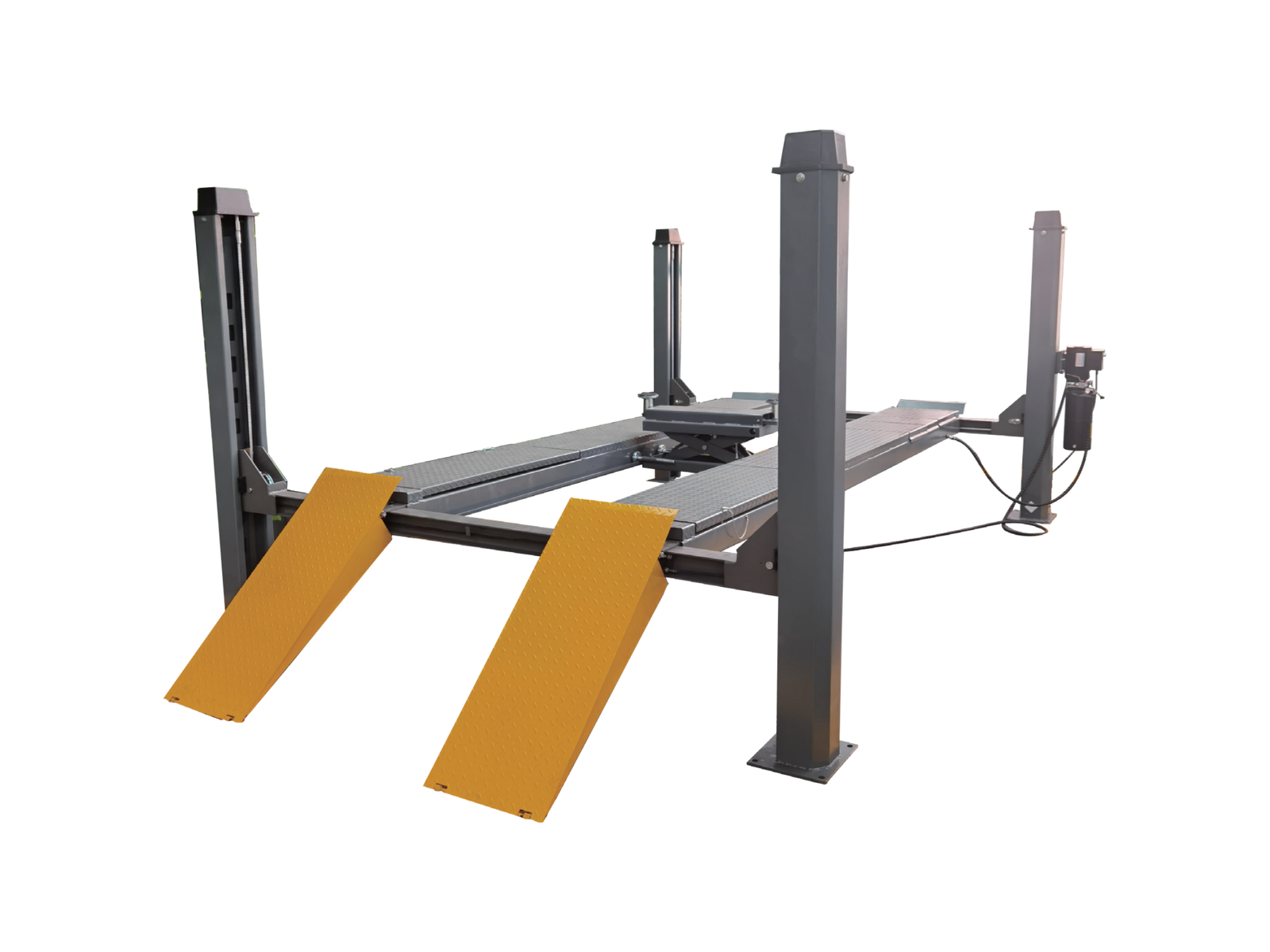 Carro auxiliar de elevación secundaria disponible en versión manual, neumática o hidráulica para cambios de ruedas y operaciones de chapa.
